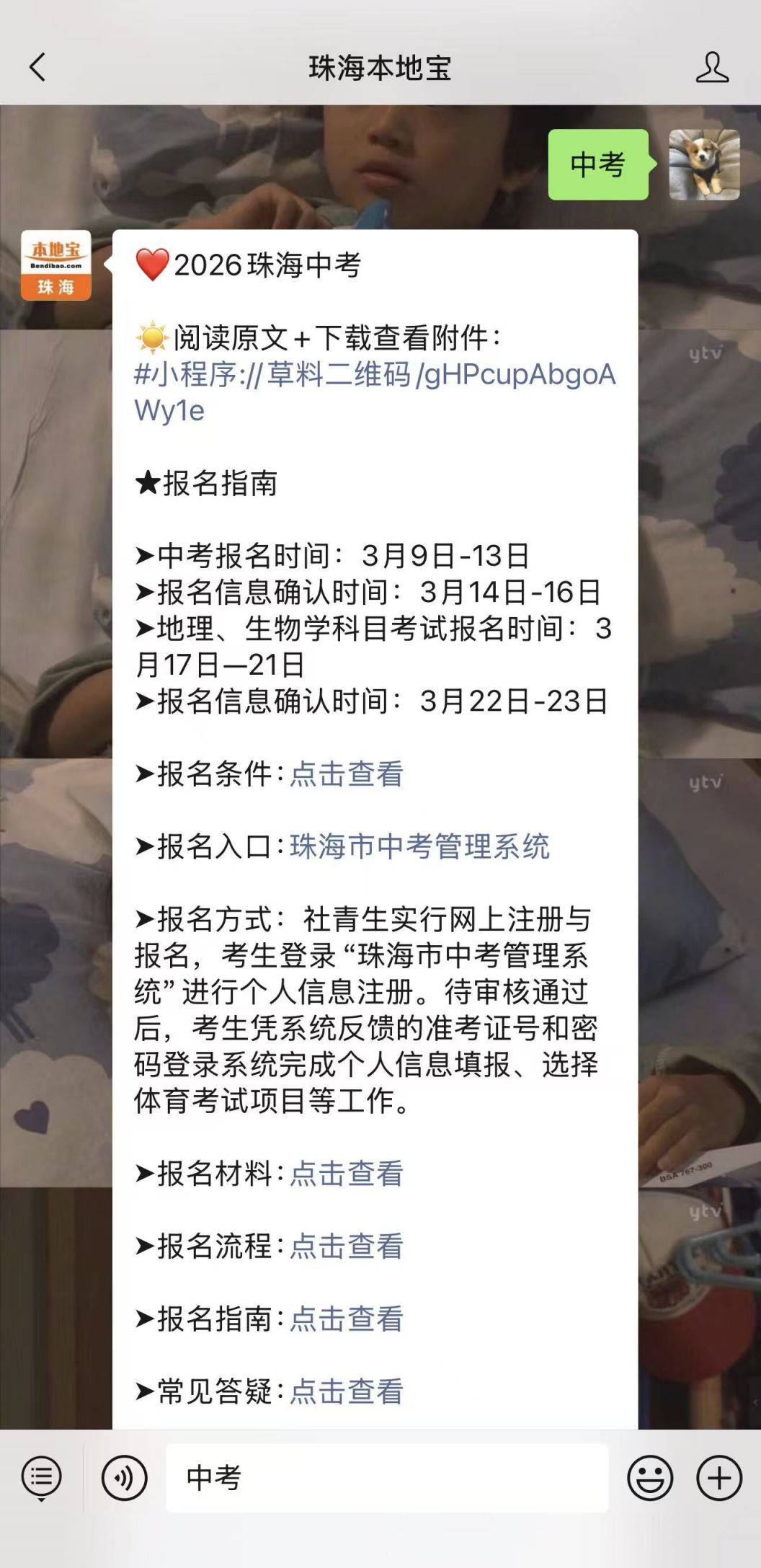 温馨提示:微信搜索公众号【珠海本地宝】,关注后在对话框回复【中考】可获2026珠海中考报名/信息确认时间,报名条件,报名入口/材料/流程/指南,常见答疑汇总,通知原文及查看附件下载等。